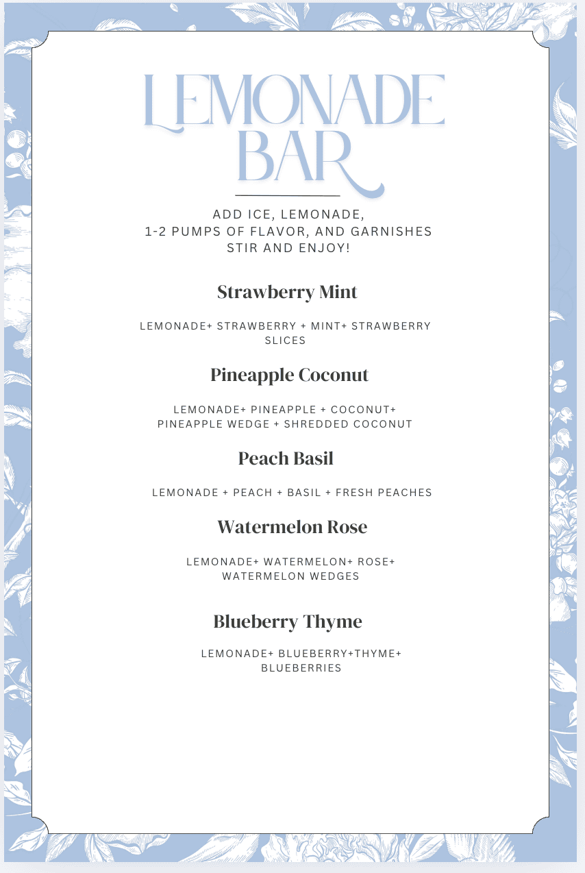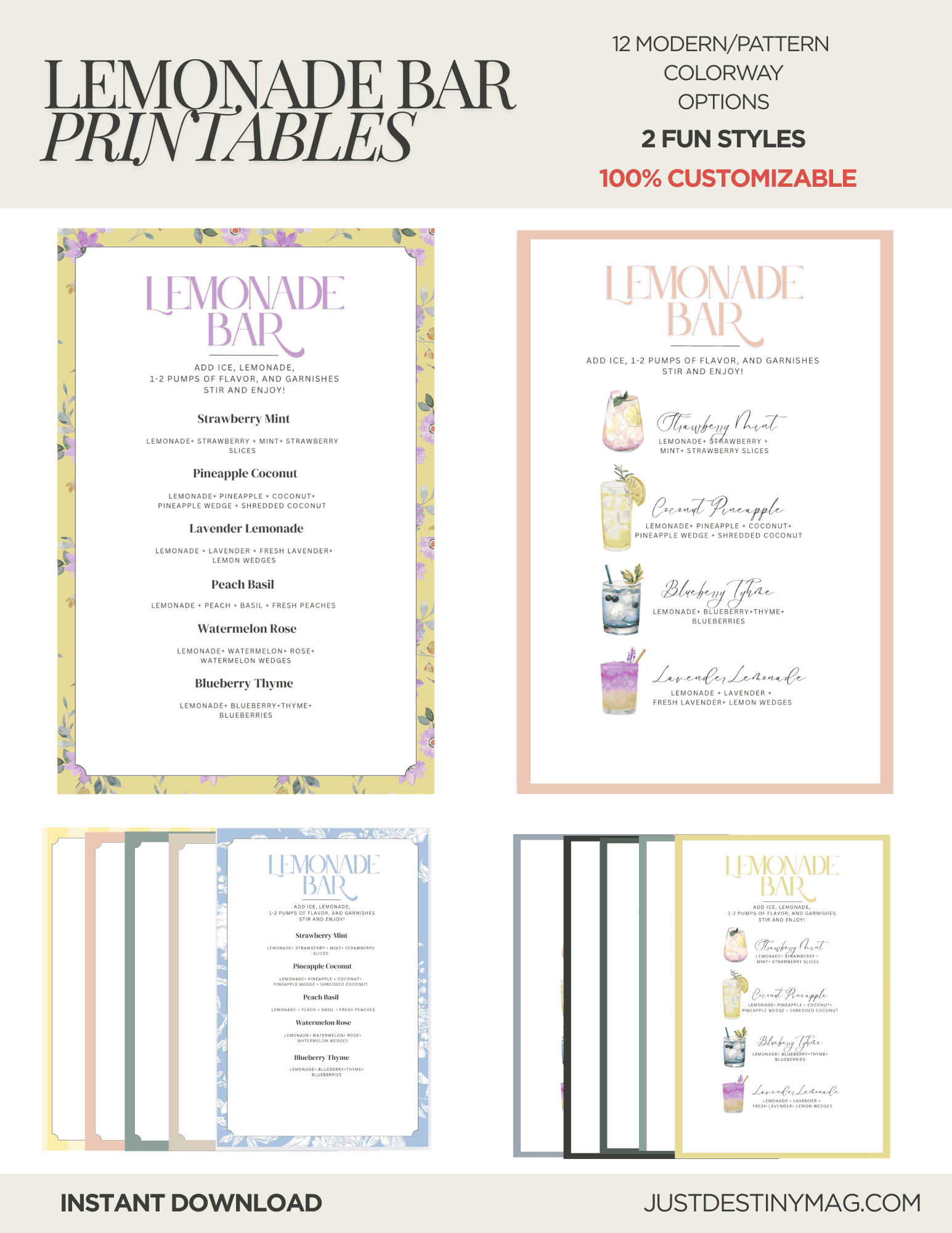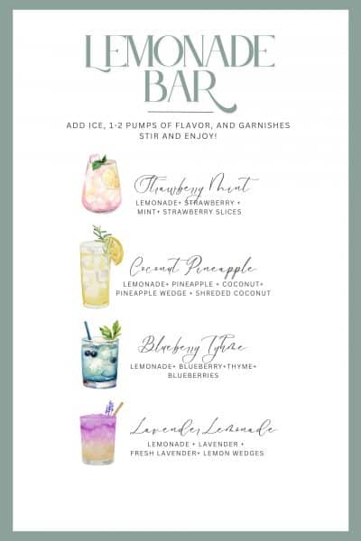 Add charm and ease to your next summer party with this printable lemonade bar sign! Includes elegant signage with easy recipe cards to help you host beautifully and effortlessly.