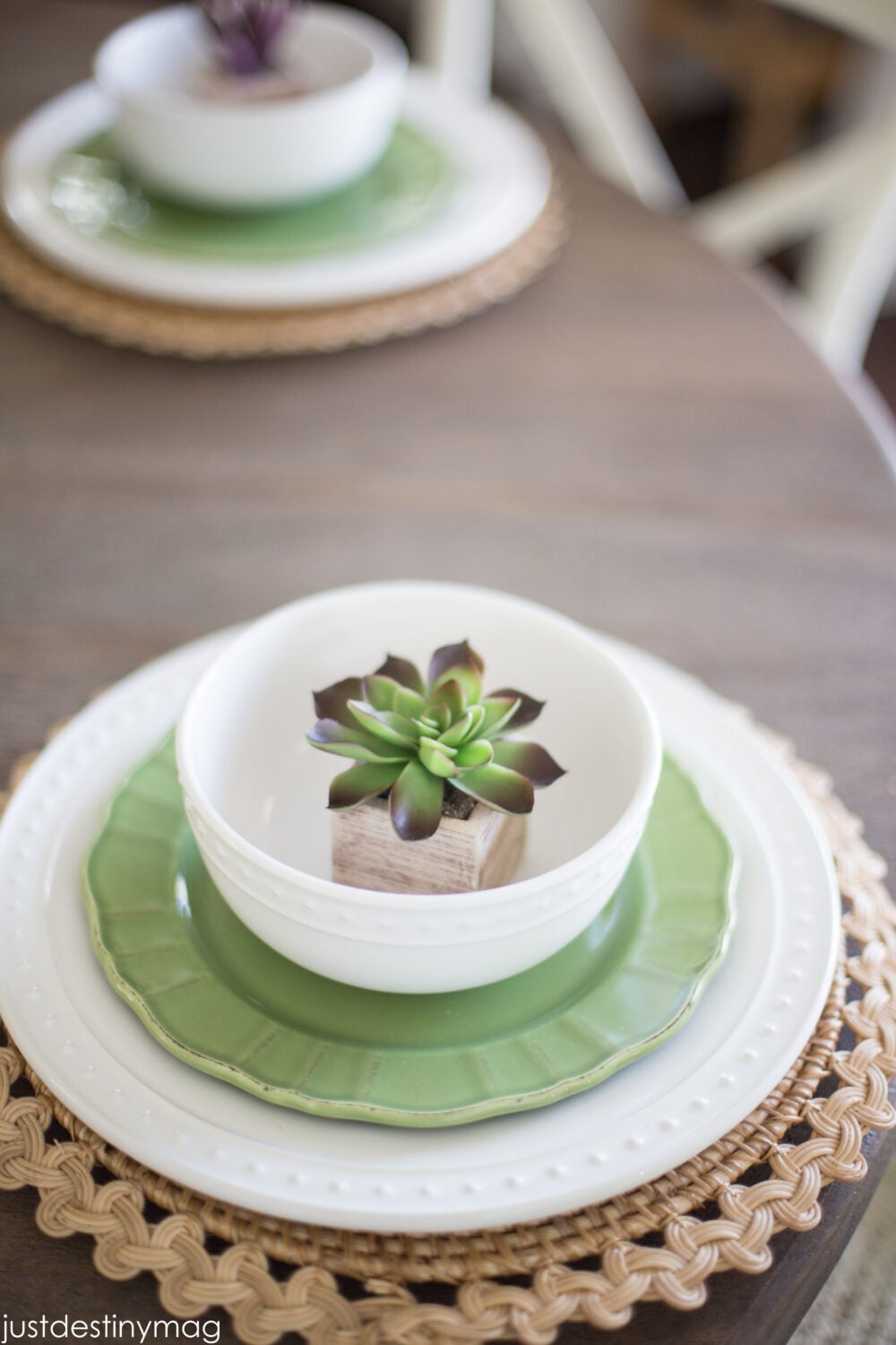 Now I don’t always ( Ok almost NEVER. ha) set the table but today I was feeling fancy so I decided to mess around with this set. I love how it turned out. The color combo is my JAM! So simple and fresh. Plus the little faux succulent touch makes it perfect.